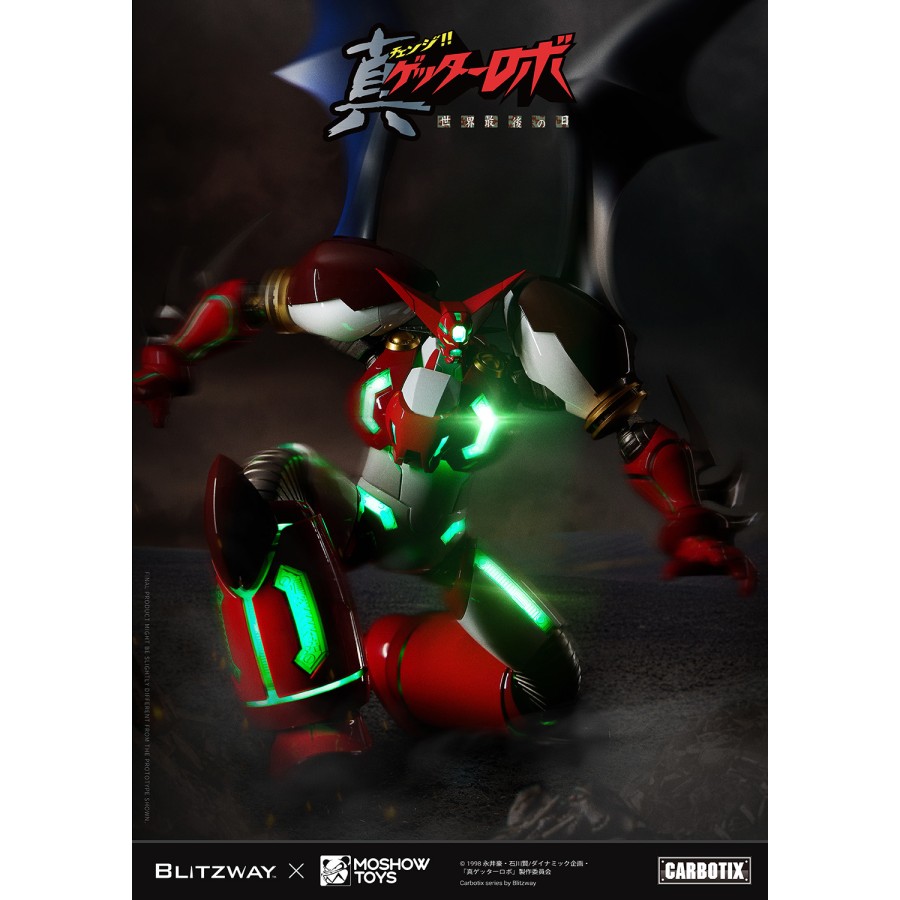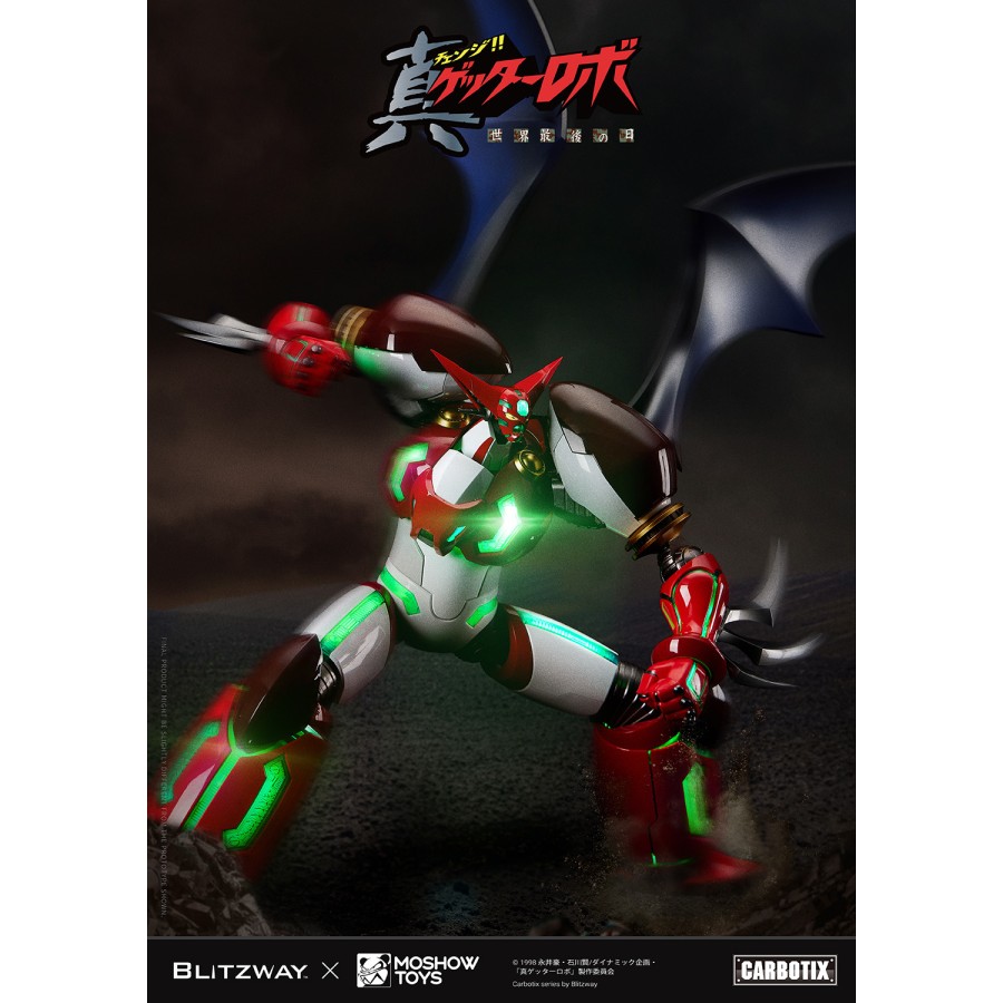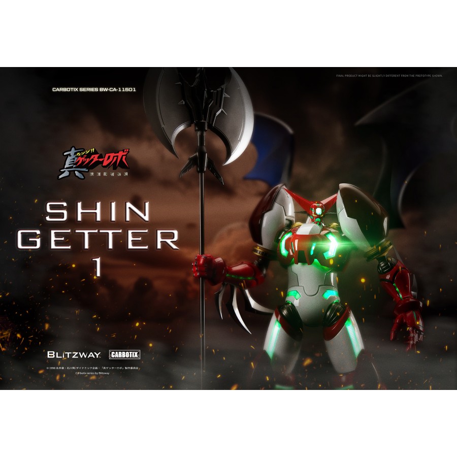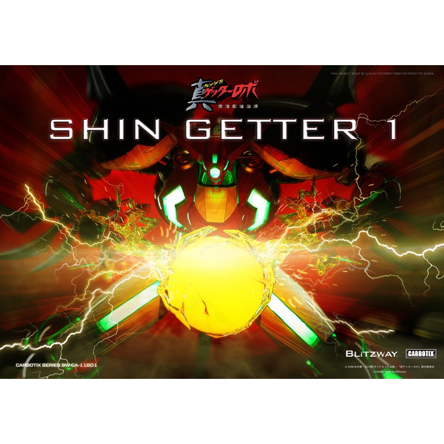 Shin Getter 1 tratto da Getter Robo Armageddon entra nella line-up 5PRO Studio Blitzway CARBOTIX, azione completa con 44 punti di articolazione, alto 26cm, realizzato in ABS, PVC e metallo die-cast. Viene fornito con una speciale base diorama, 4 volti intercambiabili, 10 mani intercambiabili, Battle Wing, Getter Tomahawk, Getter Scythe, parti di effetto ed é dotato di un sistema illuminazione LED che necessita di 2 batterie AG1 per la parte di effetto Shin Getter Beam e 2 batterie AG13 (NON INCLUSE) per la parte di effetto Stoner Sunshine